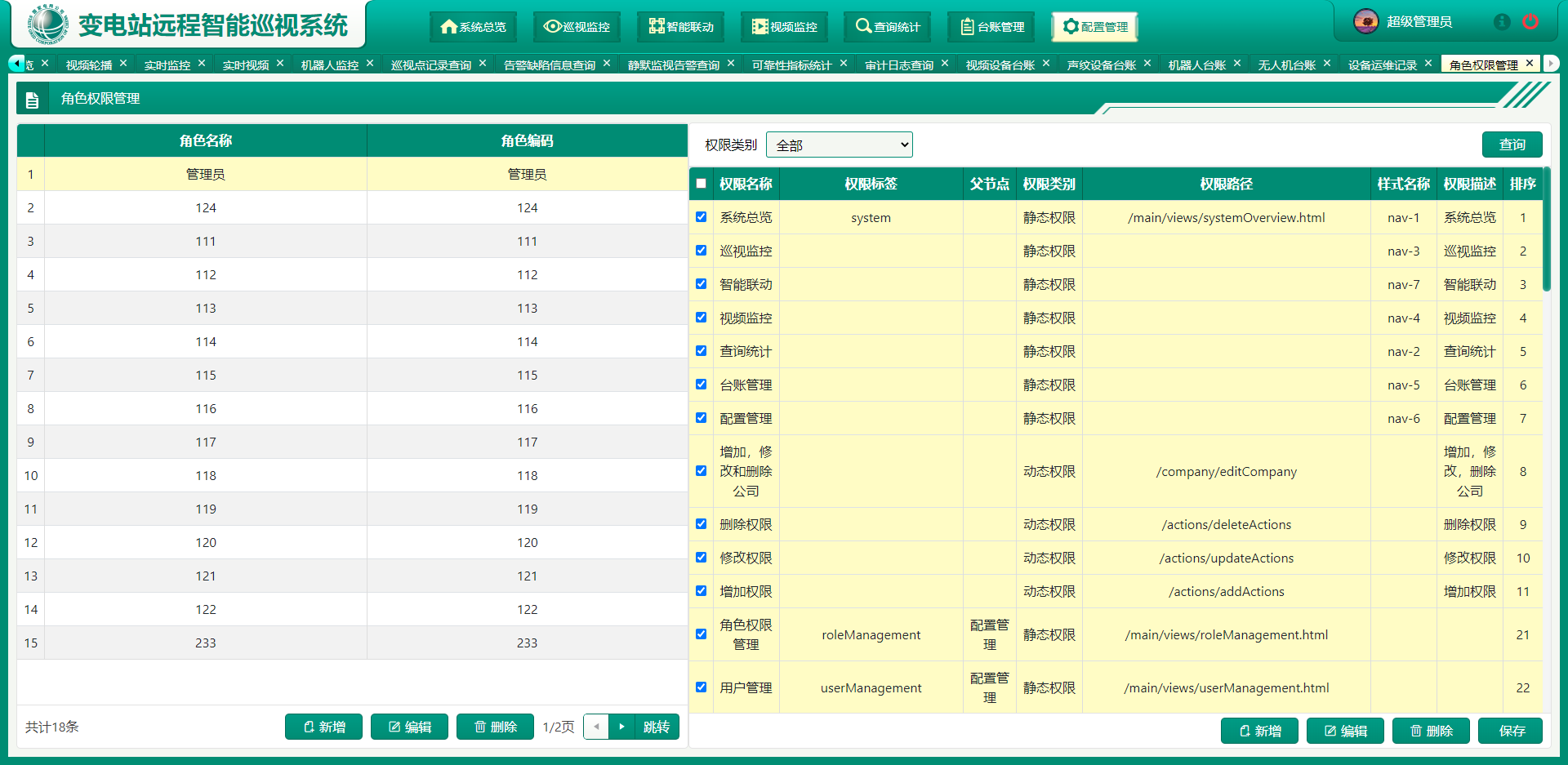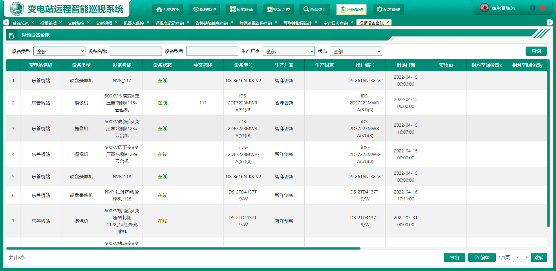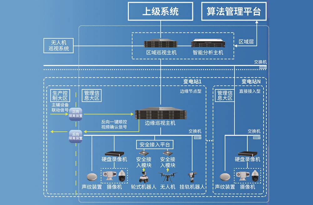 变电站远程智能巡视系统通过各类高清摄像机和室内外巡检机器人对现场巡视点位进行抓图和视频录制,利用人工智能图像识别技术,对设备、人员、环境、缺陷等进行智能化分析判断,从而实现变电站的智能化远程巡视。