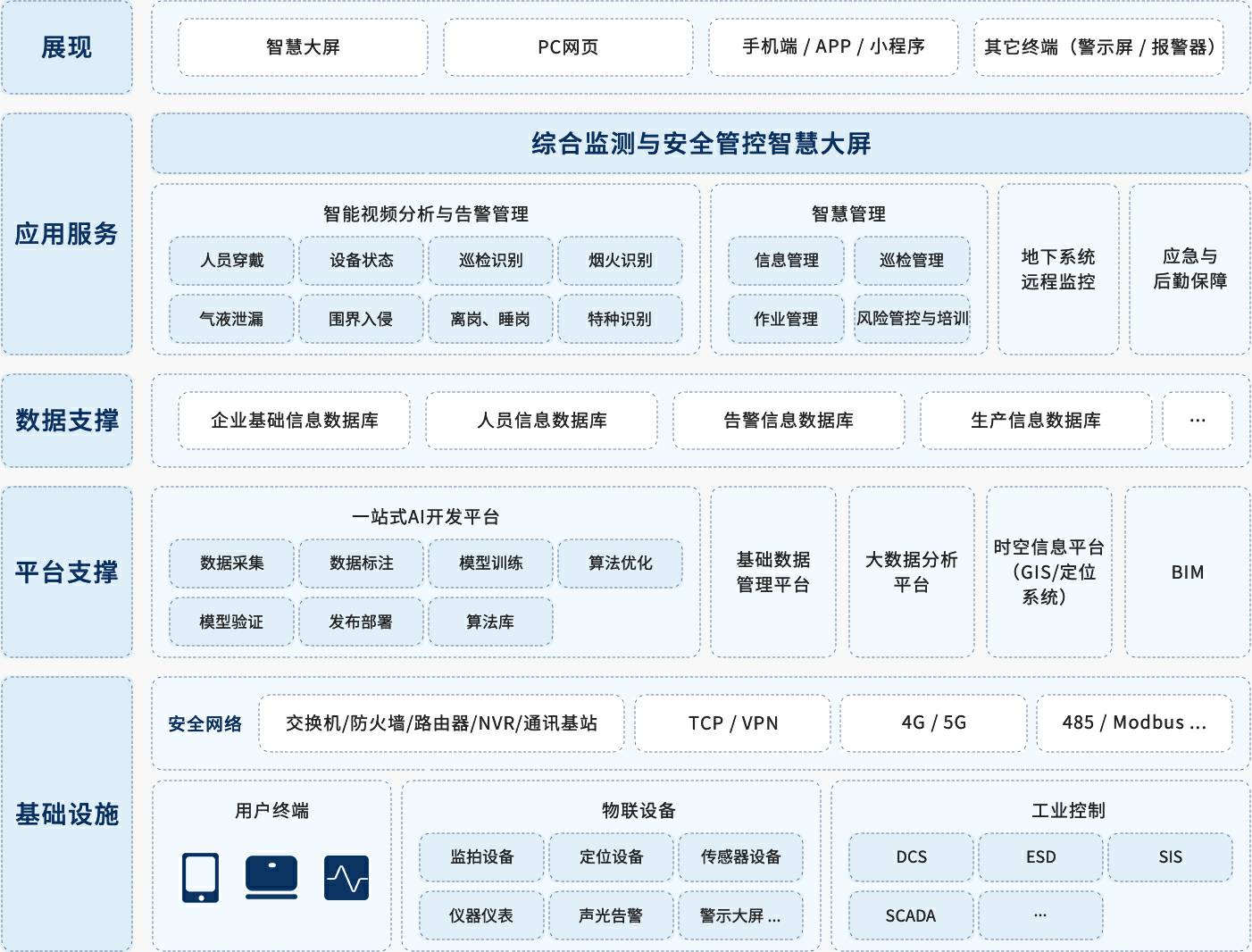 针对矿山安全生产的管理要求,紧抓需求痛点,半岛官方站网站在线-PeninSula体育网(中国)创新提出“一基础、双支撑、多平台、N应用”的智慧矿山方案,实现不同阶段需求逐步实现未来智慧矿山。半岛官方站网站在线-PeninSula体育网(中国)创新充分利用人工智能算法优势,从智能视频分析风险隐患切入,实现风险隐患全生命周期分析与管理,同时应用智慧化作业流程、智慧检维修提升作业生产效率,应急与后勤保障是重中之重,除了实现地下通风系统、定位系统、电力系统、通讯系统、排水系统以及环境监测系统的全天候监控之外,应急物资管理系统保障物资及时可用,人员设备定位系统保障下井人员位置的实时管控,充分实现应急后勤保障,半岛官方站网站在线-PeninSula体育网(中国)创新智慧矿山方案永远将安全生产放在第一位。